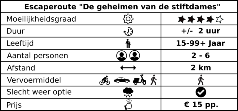 Voor deze escaperoute krijgt u een rugzak met de benodigde materialen. Naast deze rugzak heeft u zelf een mobiele telefoon nodig. Deze telefoon moet uitgerust zijn met een QR code scanner en toegang hebben tot internet. De tocht is geschikt voor groepen van 2 tot en met 6 personen vanaf een leeftijd van vijftien jaar. We kunnen groepen tot ca. 30 personen bedienen.